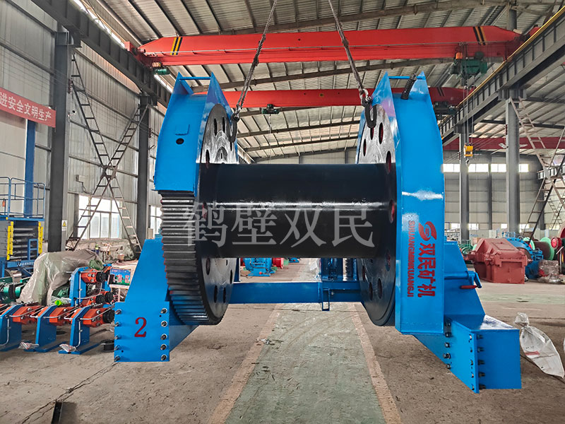 本絞車主要用于煤礦、金屬礦和非金屬礦豎井井筒掘進時懸吊吊盤、水泵、水管、注漿泵、風筒等掘進設備和張緊穩繩,該絞車系雙鋼絲繩懸吊。將減速機上的差動手把放在差動位置,若張緊穩繩,可使兩根穩繩的張緊力保持相等;若懸吊水管、注漿管、風筒等管類設備,可保證其被懸吊管類設備與地面保持垂直的狀態。如果懸吊吊盤等盤狀設備,需將其差動手把放在直通位置,才能實現兩繩繩速的一致。