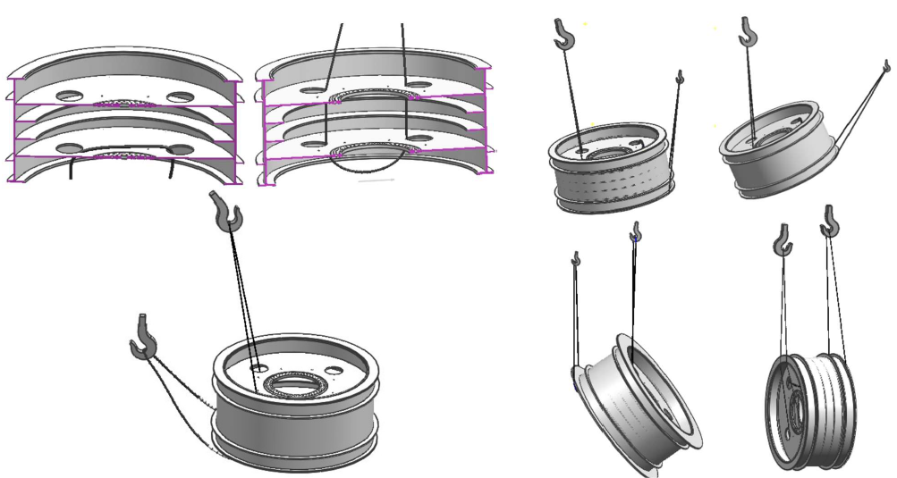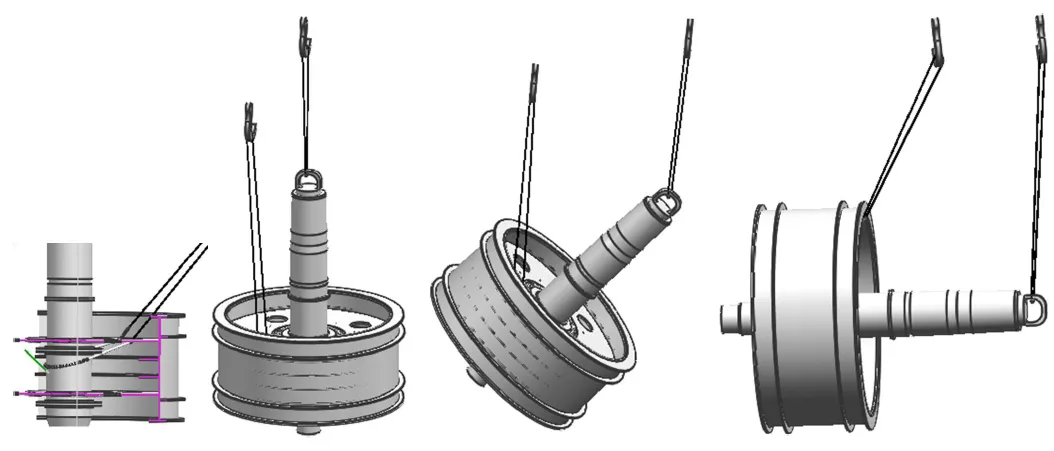 吊點附近的輪子輪緣之間,需用螺紋千斤頂輔助支撐,以防止在起吊中變形;起吊翻轉(zhuǎn)過程中人員與工件要保持足夠的安全距離,避免千斤頂墜落傷人。