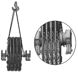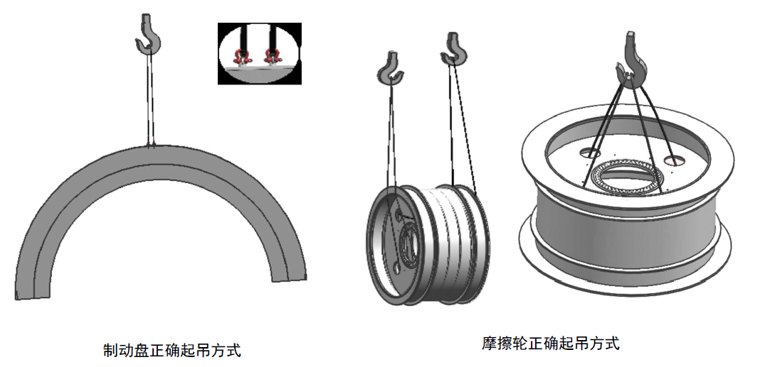 采用兩根等長鋼絲繩,左、右側(cè)各掛一根鋼絲繩,吊點在由上到下第三個輪子的上、下槽鋼中間空隙處,不準(zhǔn)許直接兜吊下側(cè)槽鋼。此種起吊方式嚴(yán)禁帶軸承座及端蓋。