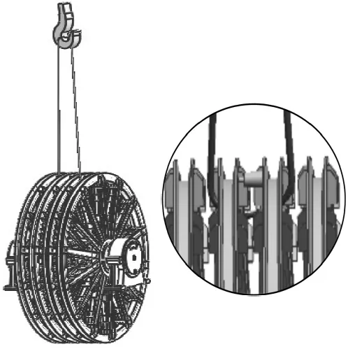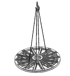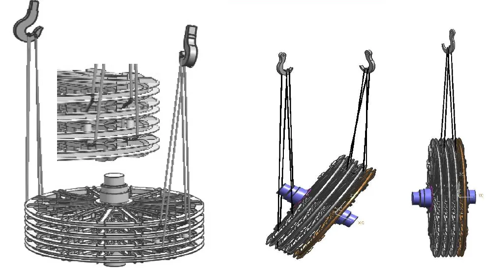 4m以下規(guī)格天輪裝置:采用兩根等長鋼絲繩。鋼繩兜吊中間兩個輪子的輪緣,兩根鋼絲繩分別掛在同一處槽鋼的左、右兩側(cè)。為防止輪子變形,兩吊掛輪子之間需用千斤頂支墊。