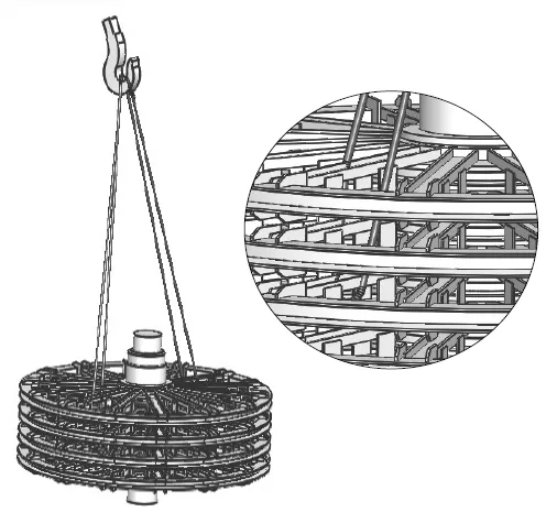 采用兩根鋼絲繩,主鉤鋼絲繩從上方腹板中一人孔穿入,繞過主軸,從同一人孔穿出。副鉤鋼絲繩通過工裝吊盤,吊在主軸上方,起輔助調(diào)平作用。主軸兩端的螺釘孔僅用于把吊具,不能直接把吊環(huán)螺釘起吊。