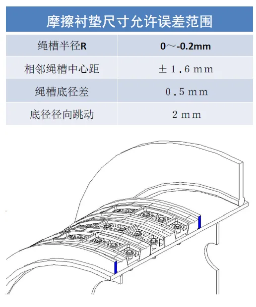 當(dāng)磨損達(dá)到一個鋼絲繩直徑的深度,或沿側(cè)面磨損達(dá)鋼絲繩直徑一半時,或襯墊磨損后剩余厚度為鋼絲繩直徑的一半時,三種情況中有一種就應(yīng)更換襯墊。