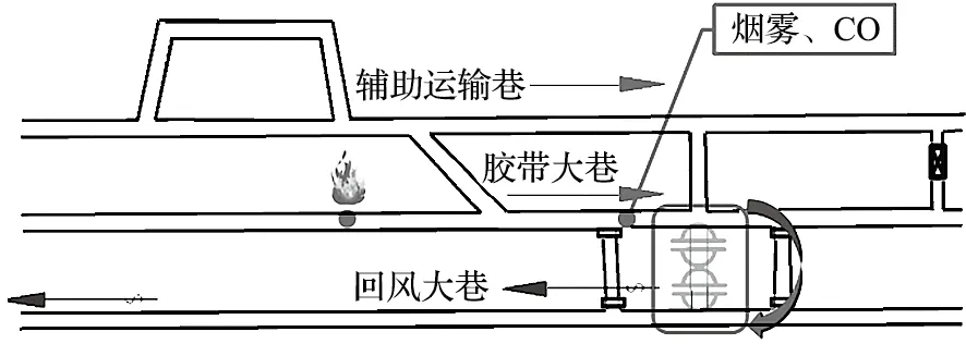 3.3.2 開拓大巷災(zāi)變條件下優(yōu)化方案 當(dāng)開拓大巷某一地點(diǎn)發(fā)生火災(zāi)等事故時(shí),由于明火存在火風(fēng)壓,在自然通風(fēng)條件下,明火與有毒有害氣體會(huì)隨風(fēng)流向下游區(qū)域蔓延。為準(zhǔn)確監(jiān)測災(zāi)變后的氣體特征,需要安裝煙霧和 CO 報(bào)警傳感器。當(dāng)監(jiān)測氣樣指標(biāo)超限時(shí),系統(tǒng)自動(dòng)打開膠回聯(lián)巷處的 2 道風(fēng)門,實(shí)現(xiàn)局部巷道的風(fēng)流短路,改變供風(fēng)方向,切斷向下游蔓延的氣體擴(kuò)散通道,從而達(dá)到保護(hù)下風(fēng)側(cè)作業(yè)人員生命安全的效果。風(fēng)流短路調(diào)控路線如圖5所示。