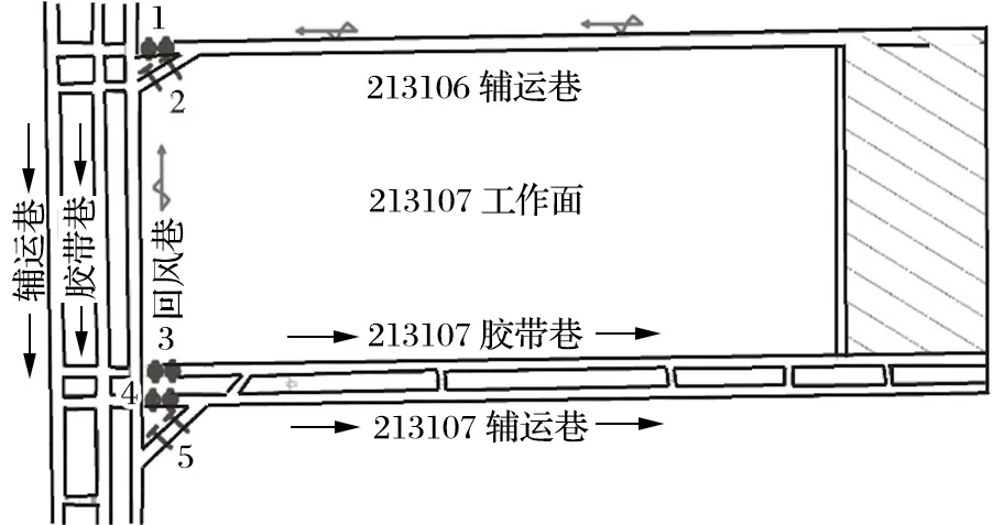 以213107 工作面為例,分別在 213106 輔運(yùn)巷安裝 2 道風(fēng)門,213107 膠帶巷安裝 1 道風(fēng)門,在 213107輔運(yùn)巷及專回各安裝 1 道風(fēng)門。采煤工作面風(fēng)流優(yōu)化系統(tǒng)如圖4 所示。其中編號(hào) 1、3、4 為自吸風(fēng)門;編號(hào) 2、5 為自調(diào)節(jié)風(fēng)門。正常通風(fēng)時(shí),打開 2、3、4 等風(fēng)門,形成 U 形全負(fù)壓通風(fēng),關(guān)閉 1、5 風(fēng)門形成閉合回路;發(fā)生災(zāi)變需要反風(fēng)時(shí),則打開關(guān)閉的 1、5風(fēng)門,形成風(fēng)向逆流,由 1 號(hào)風(fēng)門進(jìn)風(fēng),5 號(hào)風(fēng)門回風(fēng),其余 2、3、4 號(hào)風(fēng)門關(guān)閉,可實(shí)現(xiàn)反風(fēng)效果。