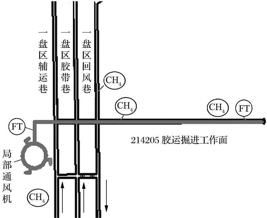 3.3.3 掘進(jìn)工作面優(yōu)化方案 在掘進(jìn)工作面新鮮風(fēng)流進(jìn)風(fēng)側(cè)安裝有 2 臺(tái)變頻軸流式局部通風(fēng)機(jī),在巷道風(fēng)門里正頭、專回口安裝有甲烷傳感器。對(duì)風(fēng)筒安裝風(fēng)壓傳感器,結(jié)合掘進(jìn)期間實(shí)際瓦斯涌出量和濃度指標(biāo),系統(tǒng)自行計(jì)算供風(fēng)量是否滿足風(fēng)排瓦斯需求,通過變頻實(shí)現(xiàn)風(fēng)量調(diào)節(jié)。掘進(jìn)工作面優(yōu)化布置如圖6 所示。