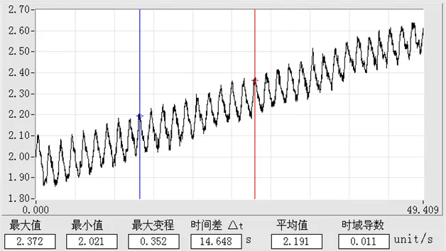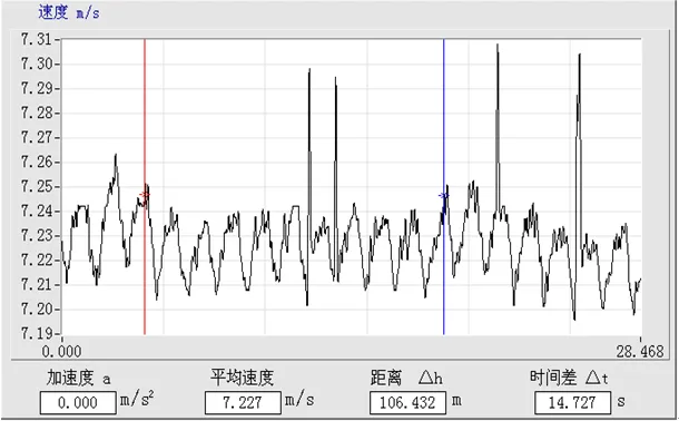 提升機的運行由電控系統控制,使用智能測試儀采集提升機配重上提時的速度曲線和電動機電流曲線,如圖 3、4 所示。為了分析提升機zui大速度運行時提升速度和電動機電流的細節變化,通過處理得到局部放大圖,如圖 5、6 所示。