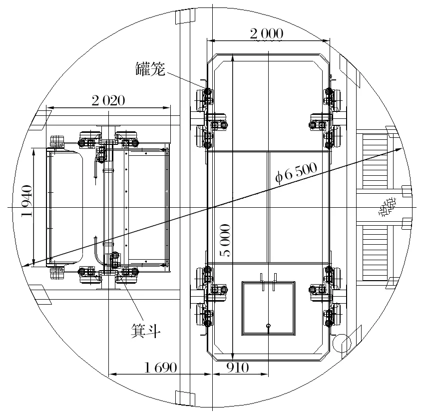 會澤礦業分公司3號豎井的井筒直徑為6.5 m,井筒布置為1臺箕斗配合1臺罐籠的混合提升方式。箕斗斷面為1 940 mm×2 0.0mm,罐籠斷面為5 0.0mm×2 0.0mm,井筒布置如圖1所示。箕斗有效容積為13 m3,zui大載重 30.35t,自重 38 t,4 根尾繩總質量為118.39 t,因此箕斗終端載荷為186.74 t。罐籠配合箕斗提升,自重 38 t,4 根尾繩總質量為118.39 t,罐籠采用雙層結構。