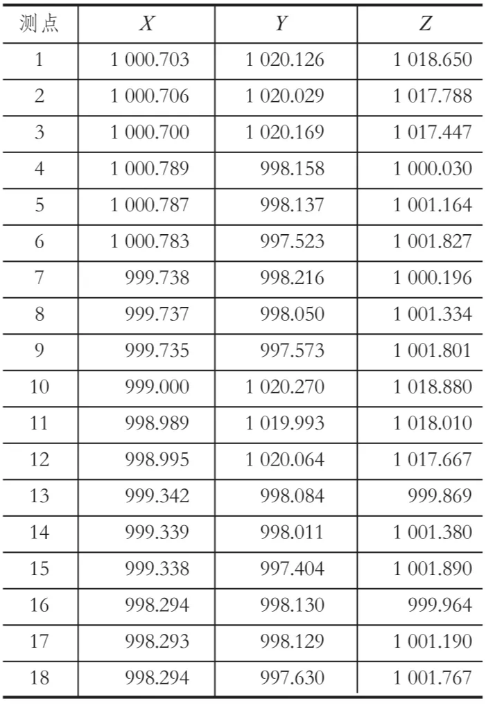 在機(jī)房內(nèi)選擇通視條件良好的位置架設(shè)全站儀,建立假定坐標(biāo)系,取測(cè)站坐標(biāo) O(1000,1000,1000),在每個(gè)天輪繩槽中間測(cè)定 1 組數(shù)據(jù) (每組 3 點(diǎn)),共測(cè)定 2 組;在卷筒擋繩板兩側(cè)內(nèi)壁各測(cè)定 1 組數(shù)據(jù) (每組 3 點(diǎn)),共 4 組。測(cè)量的數(shù)據(jù)如表 1 所列。表中,測(cè)點(diǎn) 1~ 3 為 1 號(hào)天輪實(shí)測(cè)坐標(biāo),4~ 9 為 1 號(hào)天輪對(duì)應(yīng)坐標(biāo),10~ 12 為 2 號(hào)天輪實(shí)測(cè)坐標(biāo),13~ 18 為 2 號(hào)天輪對(duì)應(yīng)坐標(biāo)。