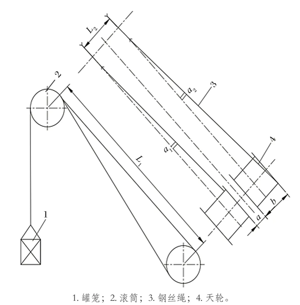 根據(jù)《金屬非金屬礦山安全規(guī)程》第 6.4.4.12 條規(guī)定,1 號(hào)天輪外偏角和 2 號(hào)天輪外偏角都超過了規(guī)定的 1°30′,均需要進(jìn)行調(diào)整。